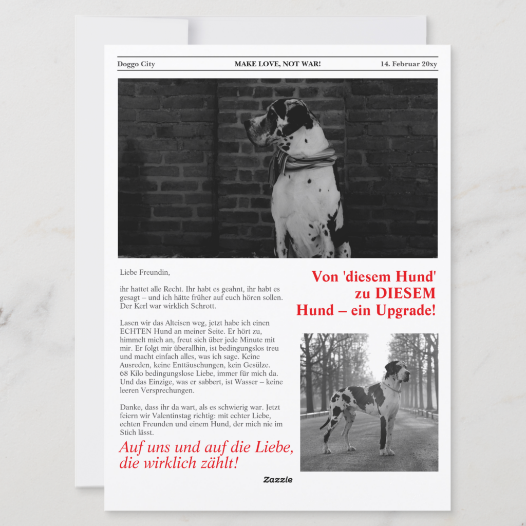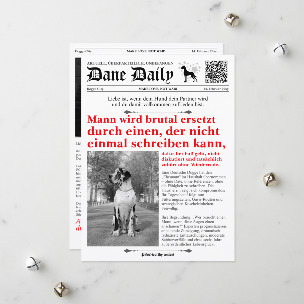 Mit der zweiseitigen, nicht faltbaren Great Dane “Best Friend” Grußkarte im Zeitungsstil feiern wir diese unbequeme Wahrheit mit maximaler Ironie und Stil. Diese Karte liest sich wie eine Schlagzeile, die längst überfällig war – humorvoll, liebevoll und ein kleines bisschen frech.